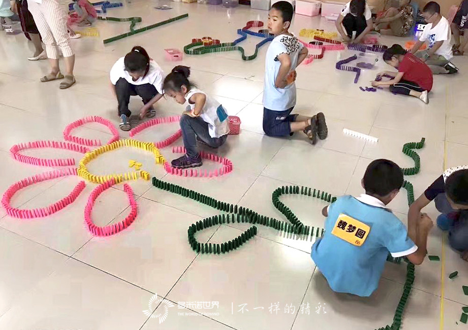8-11岁的少年朋友参加创意大挑战的比赛项目。本次的比赛主题是:各族儿童庆六一,每支参赛队都要创意码放一幅与比赛战,主题相关的多米诺图案。虽然都是第一次参加多米诺比赛,却并没有紧张与胆怯,而是将心中最美的画面,用五颜六色的骨牌堆砌展现出来。一幅幅大相径庭的多米诺画卷,同样述说着各族儿童心中对于六一的美好憧憬。